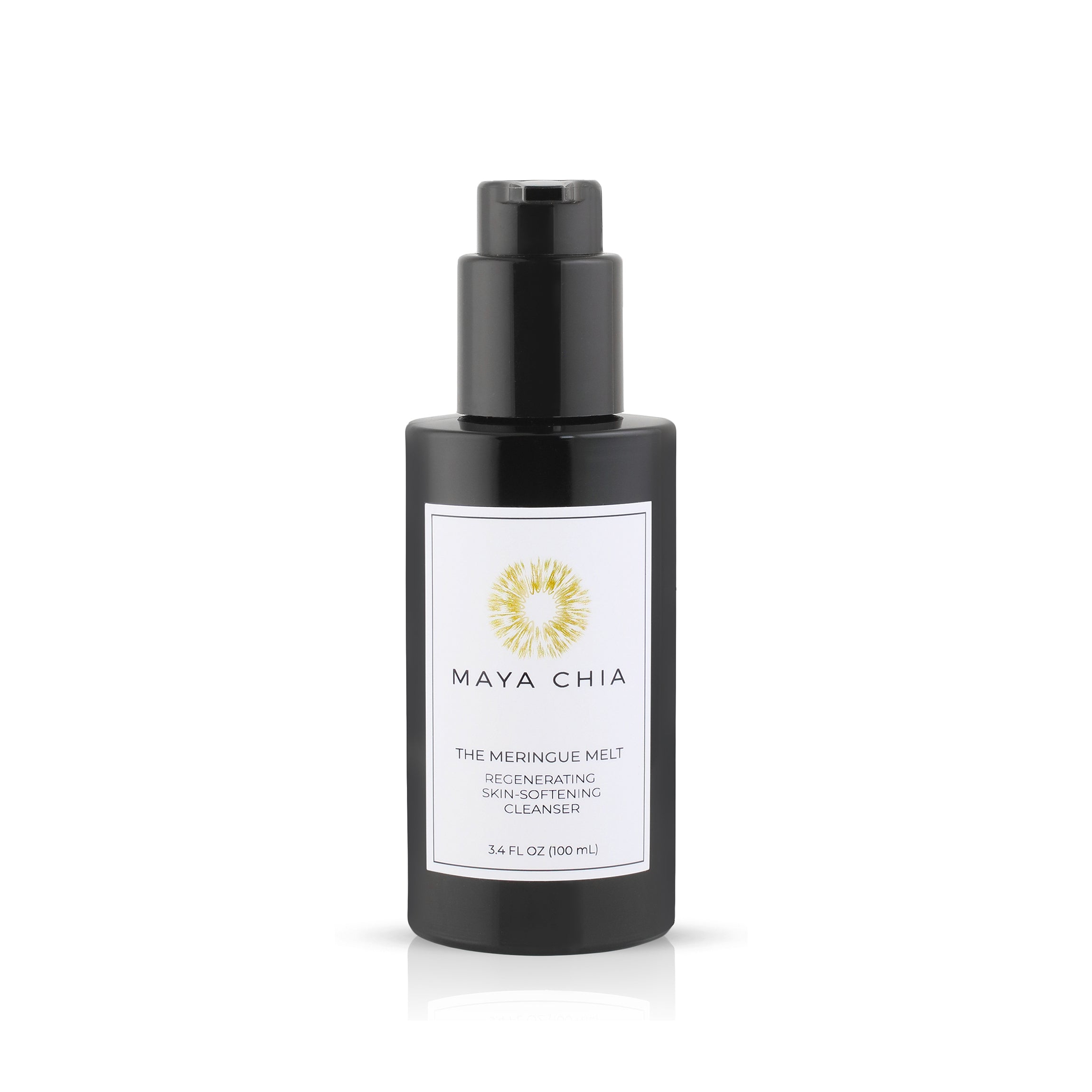• Bottle of MAYA CHIA The Meringue Melt, a gentle yet high-performance exfoliating cleanser with mandelic acid, fermented sake extract, and hydrating chia seed oil.