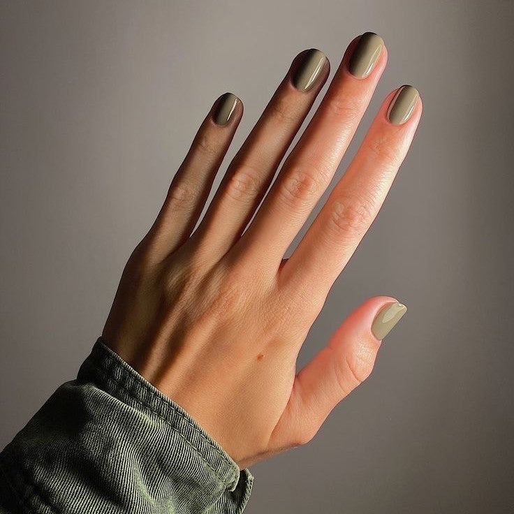 • Karolin Van Loon 08 Argile des Marais – soft khaki green nail polish, vegan, cruelty-free, 12-free, versatile for year-round wear and glossy long-lasting finish.