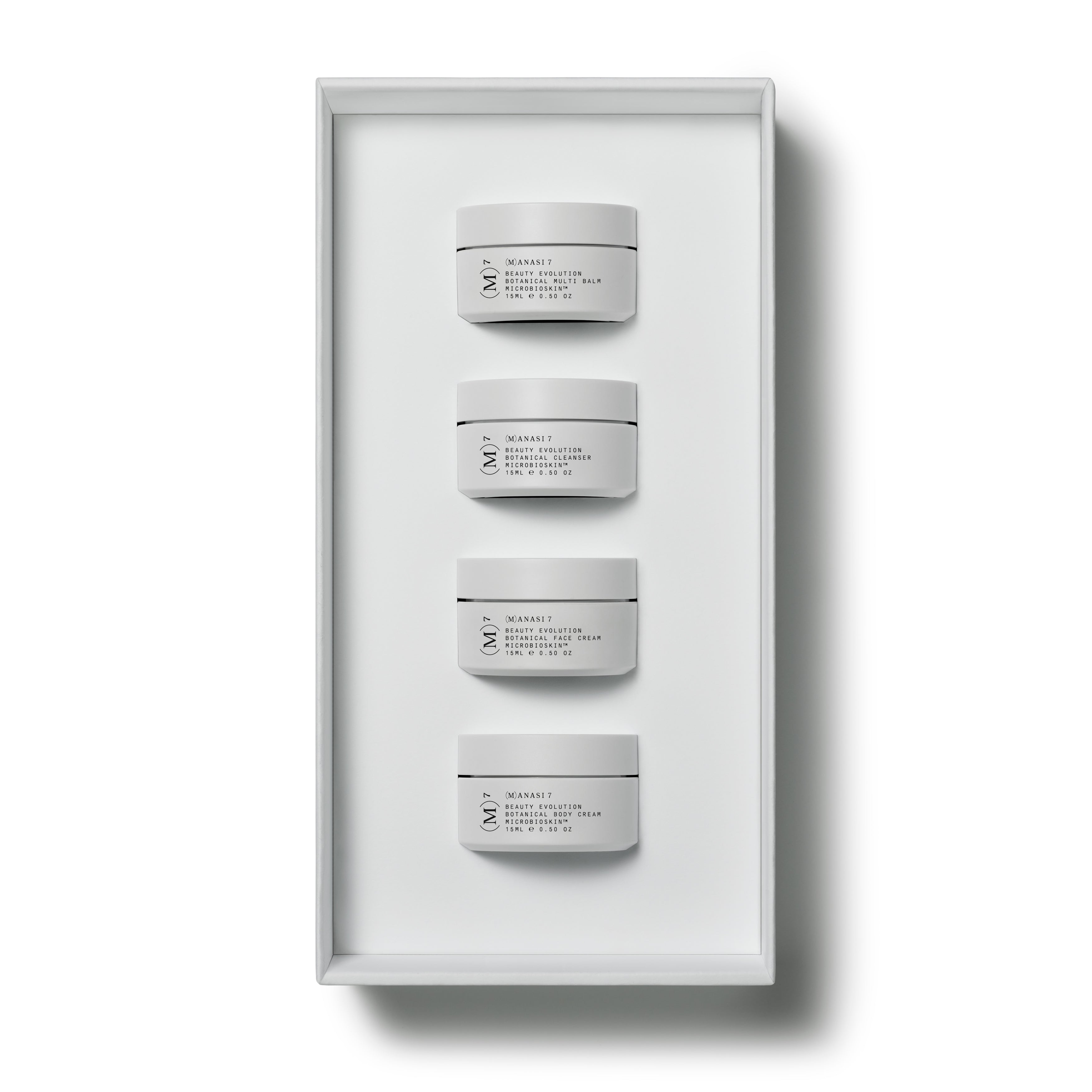 • Manasi 7 Limited Edition Discovery Set featuring four travel-size skincare jars from the Microbioskin™ collection in a sleek presentation box.