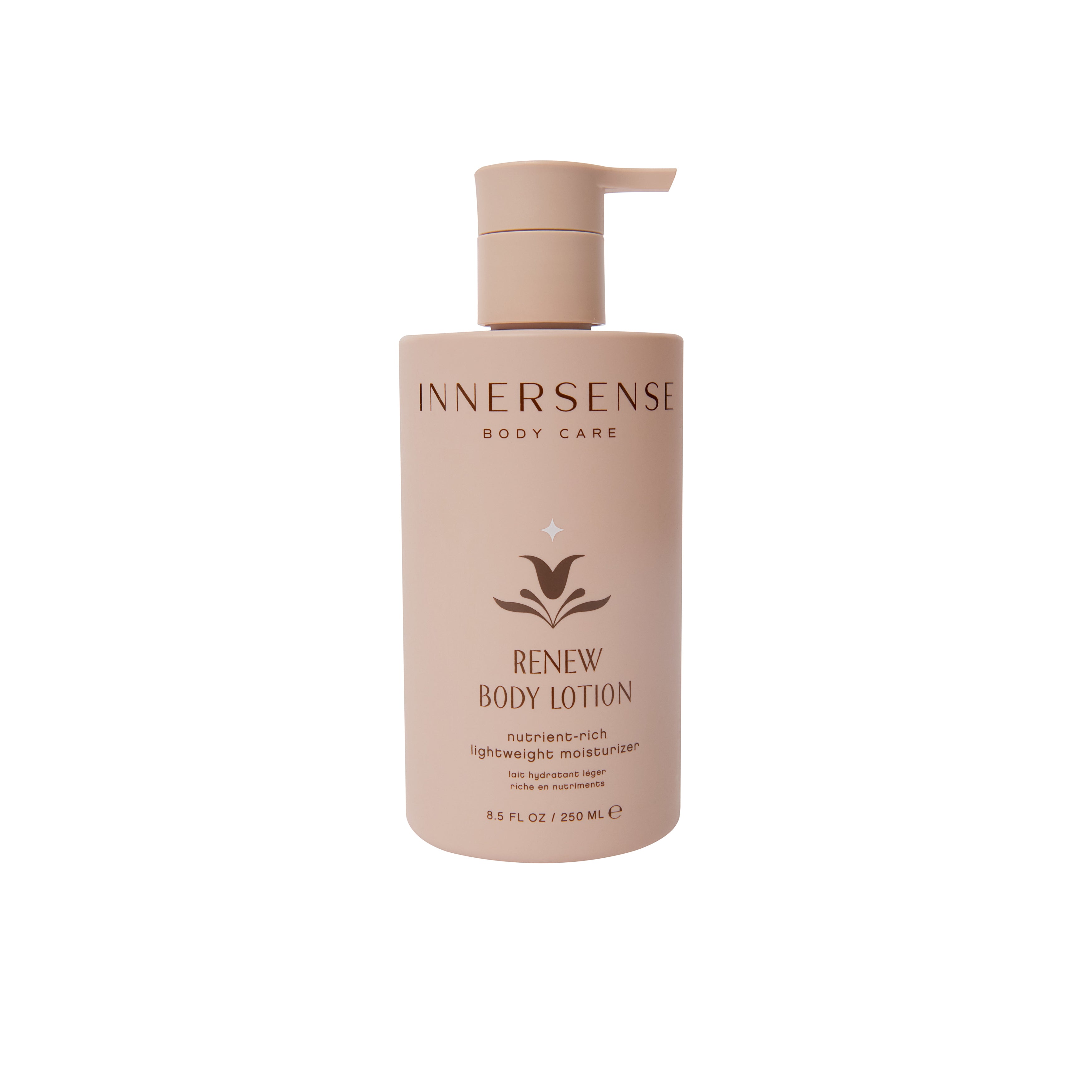 • Innersense Organic Beauty Renew Body Lotion in a 250 ml bottle, featuring a lightweight formula enriched with Kokum Butter, Pea Peptides, and vitamins for hydration and nourishment.