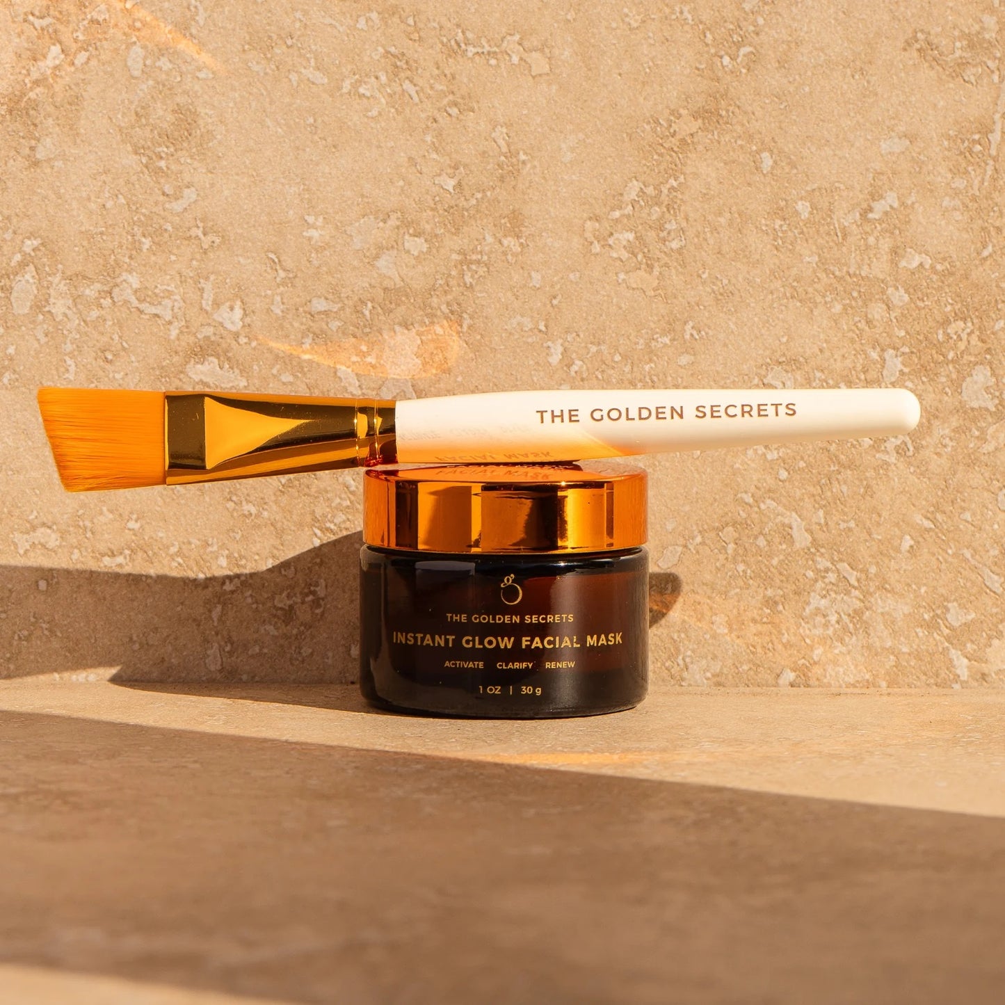 • The Golden Secrets Instant Glow Facial Mask, a purifying powder mask packed with beauty minerals, vitamins, and over 600 antioxidants. It activates to clarify, smooth, and firm the skin while promoting a refreshed, radiant complexion. Comes with a gold application brush for easy use.