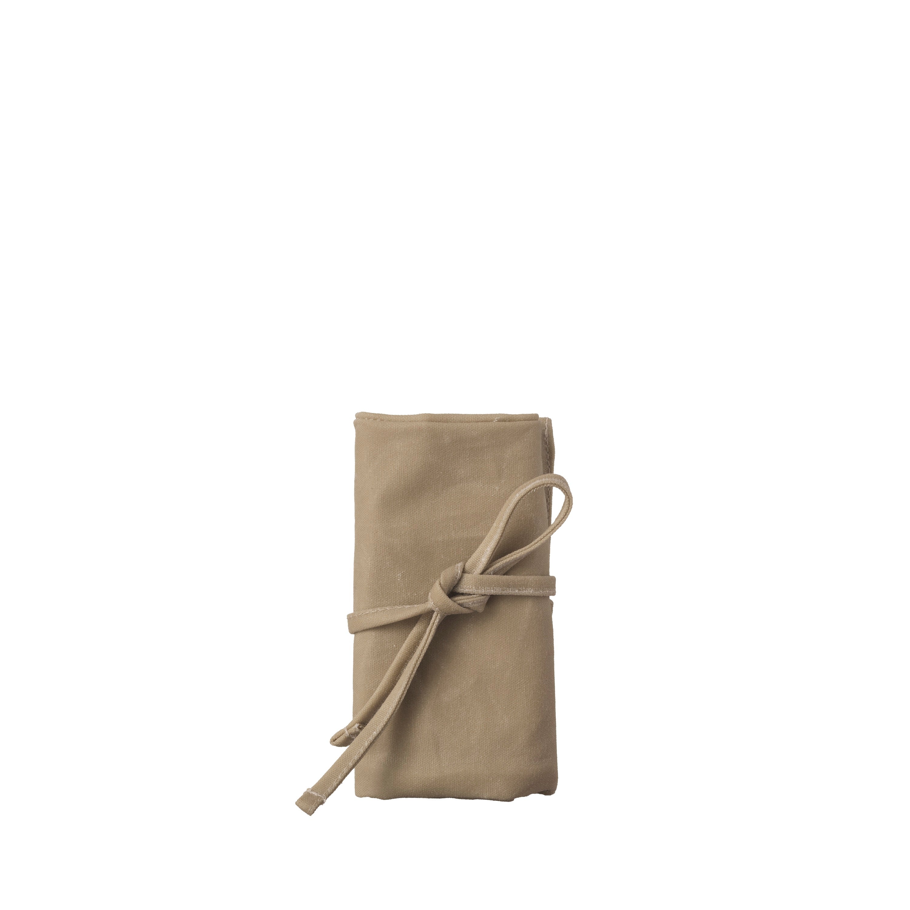 • Well Kept Razor Wrap in Stone, a durable, water-resistant waxed cotton wrap with custom pockets for a safety razor, spare blades, and blade bank.