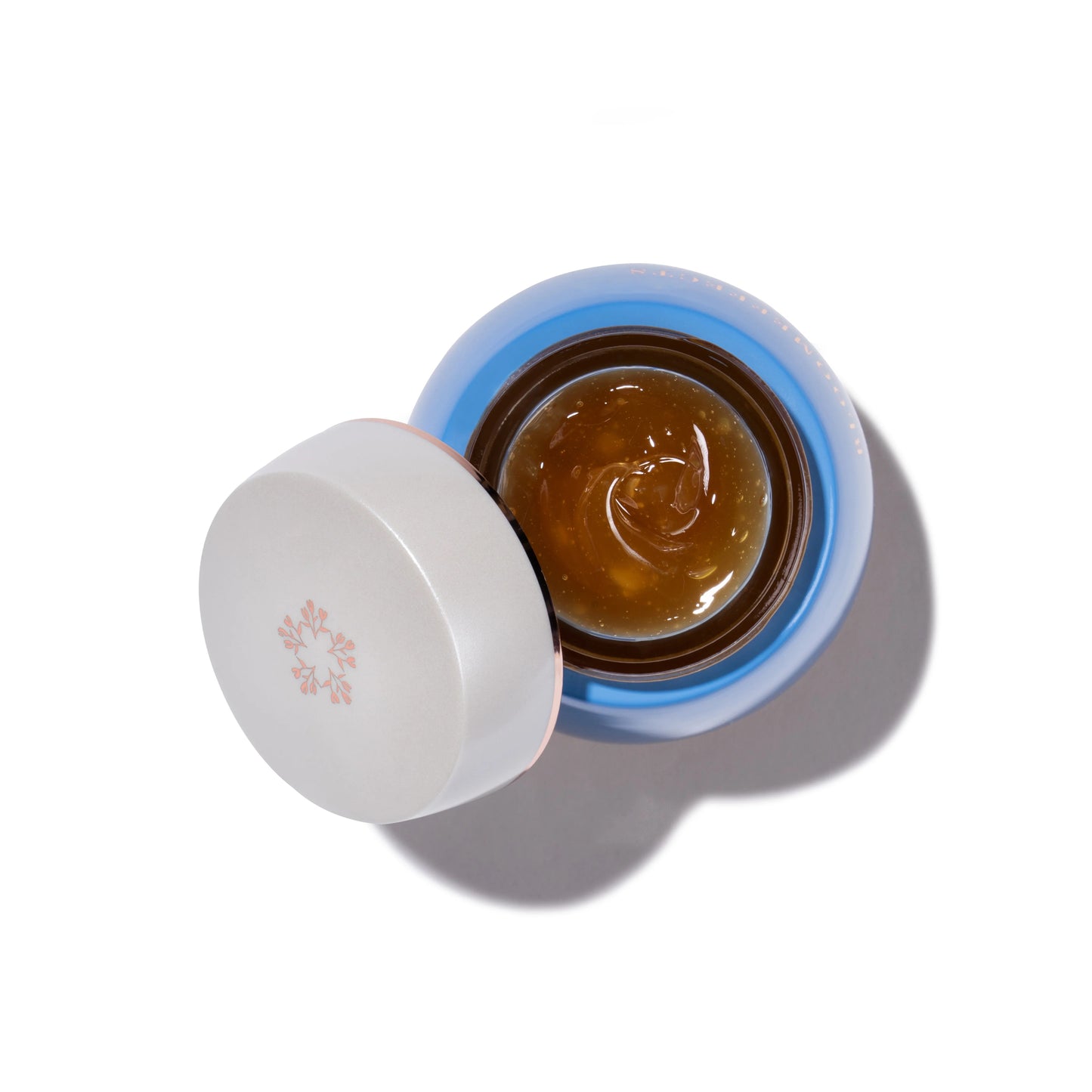 • Open blue jar of BLOOMEFFECTS Royal Tulip Moisturizing Nectar with a spoonful of the jelly like balm on a white background