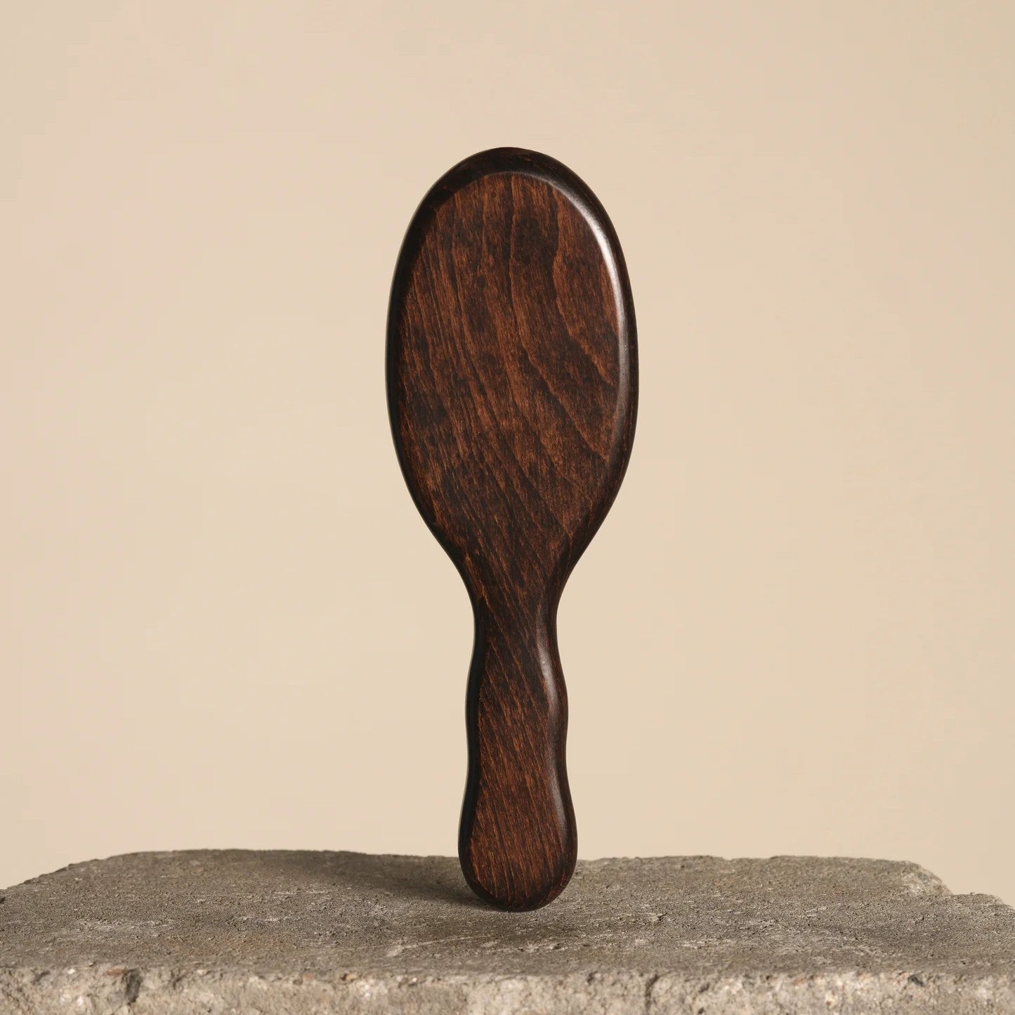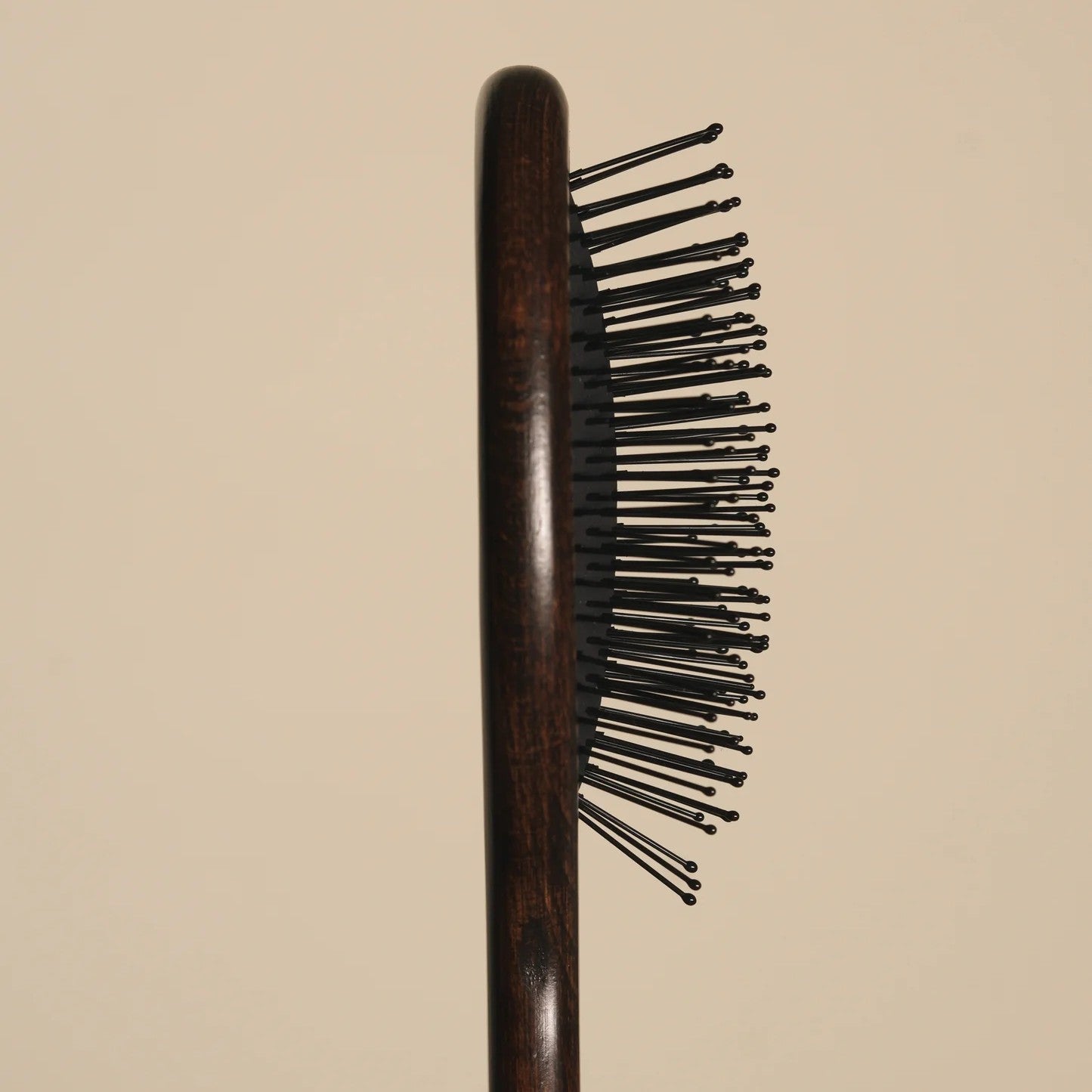 • Wooden hairbrush with black bristles on a beige background