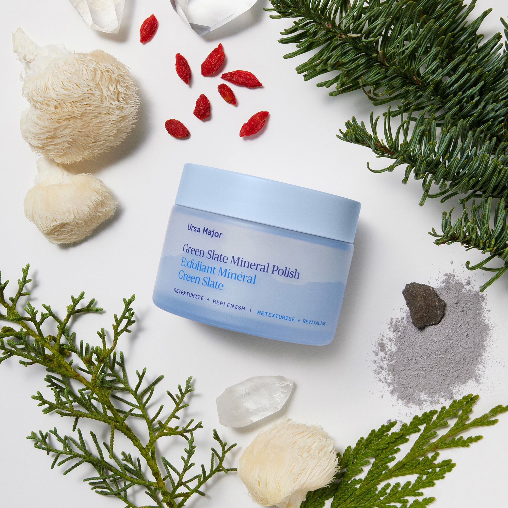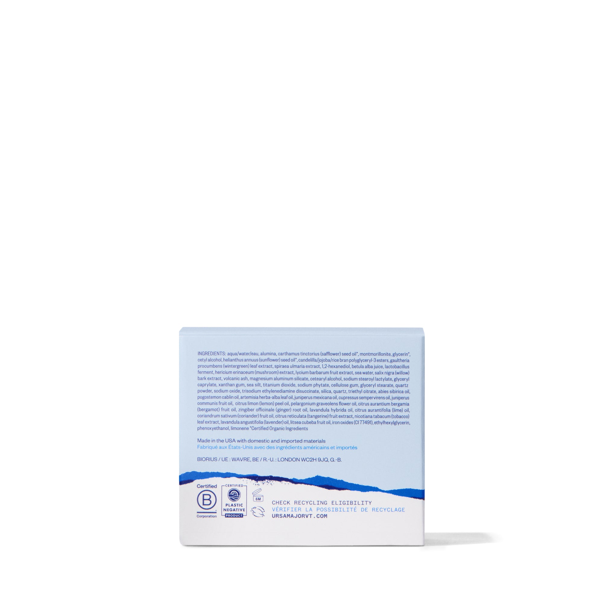 INGREDIENTI: acqua (aqua), allumina, olio di semi di carthamus tinctorius (cartamo)*, montmorillonite, glicerina*, alcool cetilico, olio di semi di helianthus annuus (girasole)*, esteri poligliceril-3 di crusca di candelilla/jojoba/riso, estratto di foglie di gaultheria procumbens (wintergreen), estratto di spiraea ulmaria, 1,2-esandiolo, succo di betula alba, fermento di lactobacillus, estratto di hericium erinaceum (fungo), estratto di frutta di lycium barbarum, acqua di mare, estratto di corteccia di salix nigra (salice), cenere vulcanica, magnesio, silicato di alluminio, alcool cetearilico, sodio stearoil lattilato, gliceril caprilato, gomma di xantano, limo marino, biossido di titanio, sodio fitato, gomma di cellulosa, gliceril stearato, polvere di quarzo, sodio ossido, etilendiammina disuccinato trisodico, silice, quarzo, trietil citrato, olio di abies sibirica, olio di pogostemon cablin, olio di artemisia herba-alba, olio di legno di ginepro mexicana, olio di cupressus sempervirens, olio di frutto di ginepro communis, olio di citrus limon, olio di pelargonium graveolens, olio di citrus aurantium bergamia, olio di radice di zingiber officinale, olio di lavandula hybrida, olio di citrus aurantifolia, olio di frutto di coriandrum sativum, estratto di frutto di citrus reticulata, olio di nicotiana tabacum, olio di lavandula angustifolia, olio di frutto di litsea cubeba, ci 77491, etilesilglicerina, fenossietanolo, limonene
