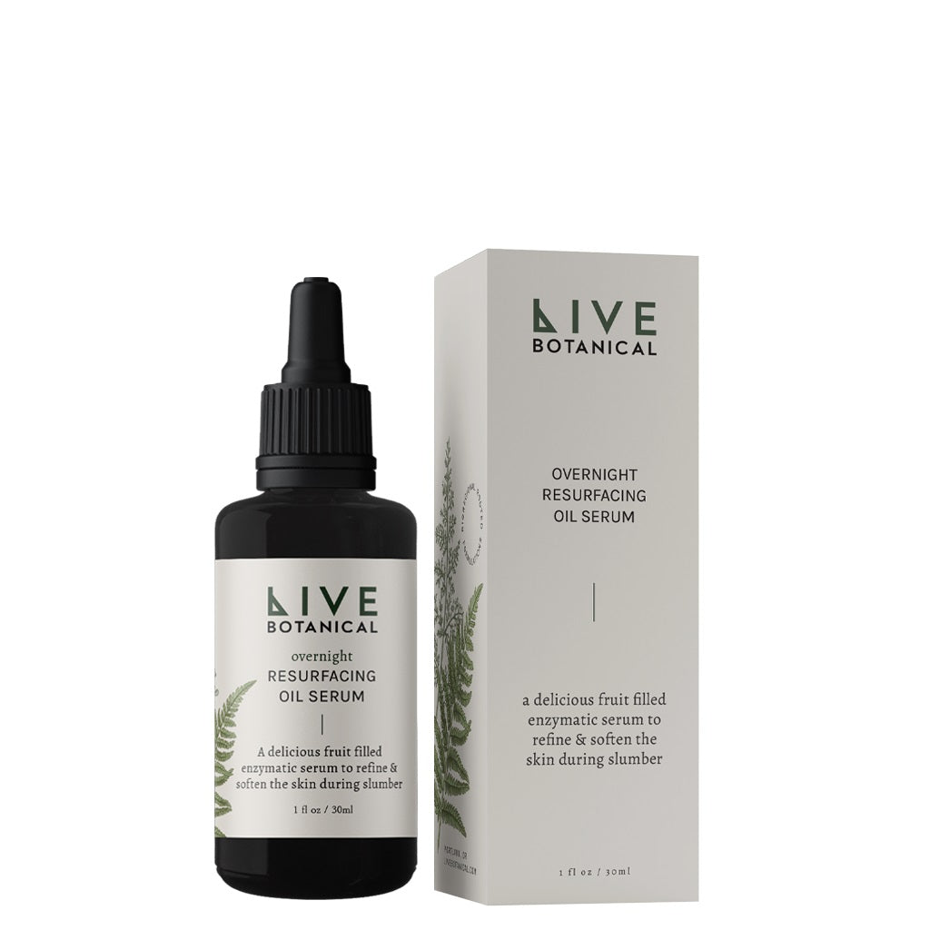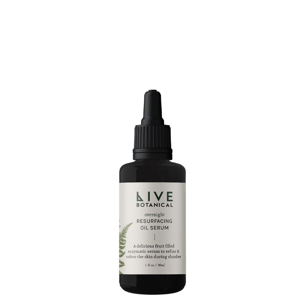 • Live Botanical Overnight Resurfacing Oil in a bottle, fruit-infused serum designed to nourish and renew skin overnight.