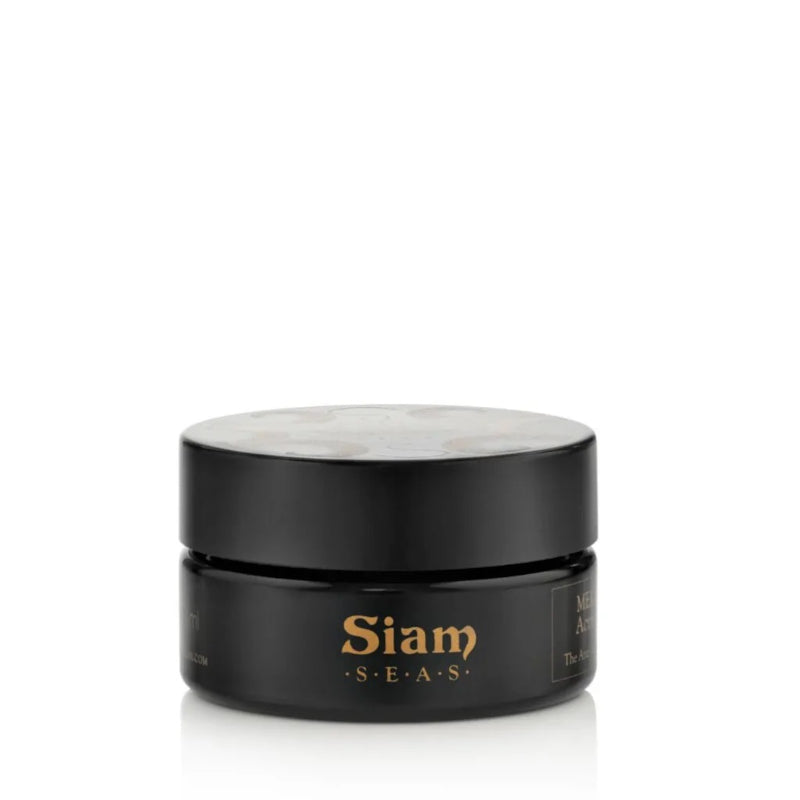 • Person holding a black jar of beige colored SIAM SEAS MEKHA Exfoliating Cleanser against a dark background
